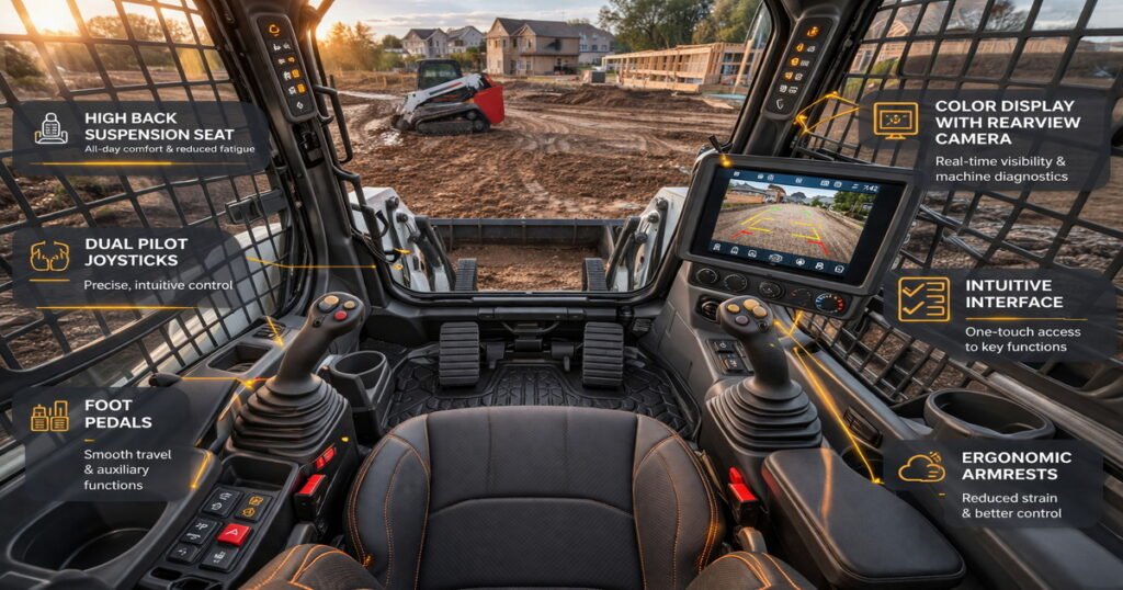 All current‑generation Takeuchi CTLs come with a spacious cab, a deluxe high‑back suspension seat and pilot‑operated joystick controls for all loader and travel functions. The company also standardized a 5.7‑inch color monitor with a rearview camera across new models, improving rear visibility and jobsite awareness.