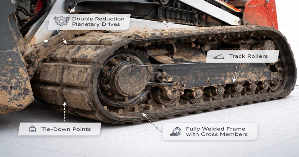 Takeuchi emphasizes a unique undercarriage design with model‑specific components matched to each platform. Tracks run on a fully welded frame with multiple cross members, and double‑reduction planetary drives are used to deliver torque in demanding applications. [compactequip]