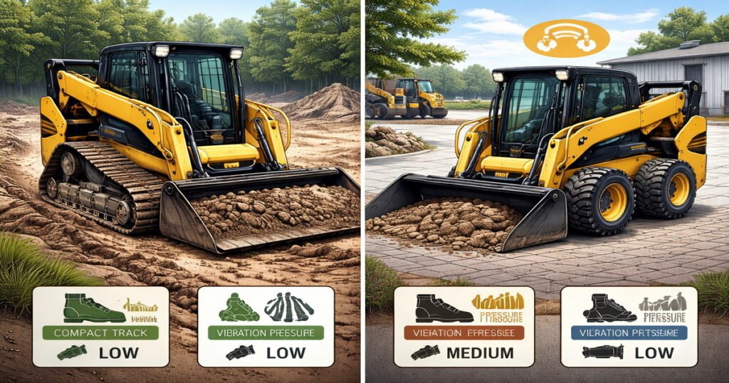 Below is a simplified view of how tracked and wheeled machines differ in comfort‑related aspects.