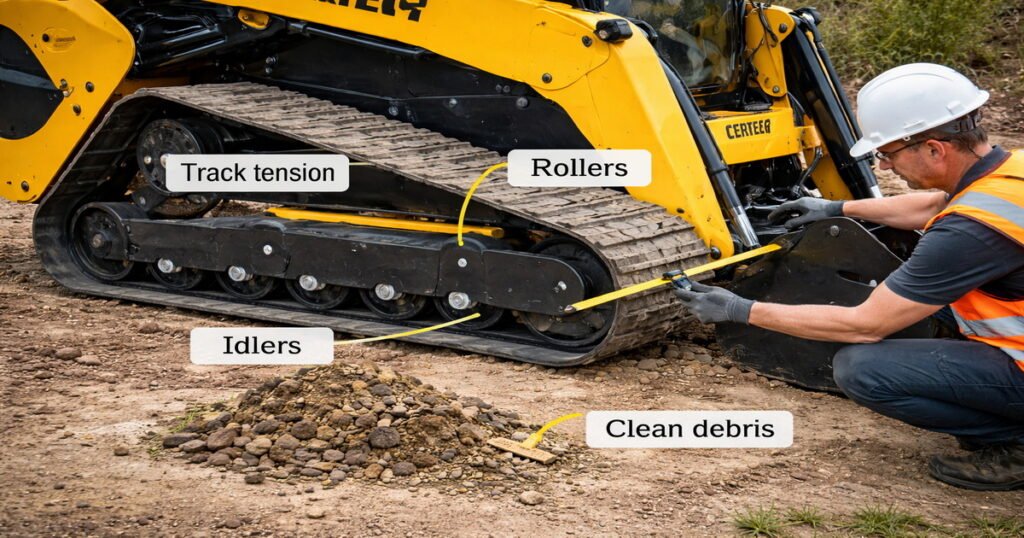 – Check and adjust track tension daily, especially in abrasive or muddy environments.